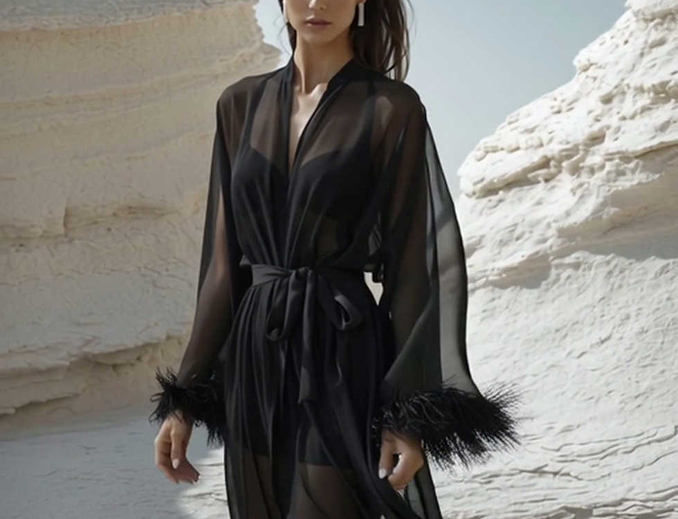 Model Francesca z kolekce Honeymoon zosobňuje lehkost, ženskou svobodu a nenucenou eleganci. Vzdušný šifonový župan z jemně transparentního materiálu splývá s tělem, jemně zvýrazňuje siluetu a vytváří smyslnou, klidnou atmosféru. Je jako stvořený pro pomalá rána, tiché večery i chvíle, kdy chcete být sama se sebou.