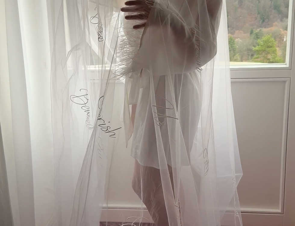 Tento svatební závoj vznikl jako tichý příběh vyšitý do prostoru. Jemný tyl nese jednotlivá slova, která jsou citlivě rozmístěna po celé ploše závoje. Každé z nich má svůj vlastní rytmus, vzdálenost i místo – stejně jako emoce, které představují.